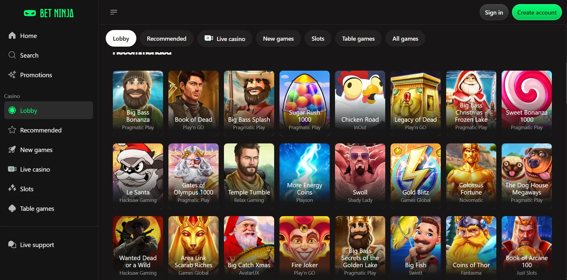 Betninja stands out most on game selection. It works as an aggregator, partnering with leading studios instead of relying on a single in-house provider. The result is a massive library with consistent quality, stability, and variety.