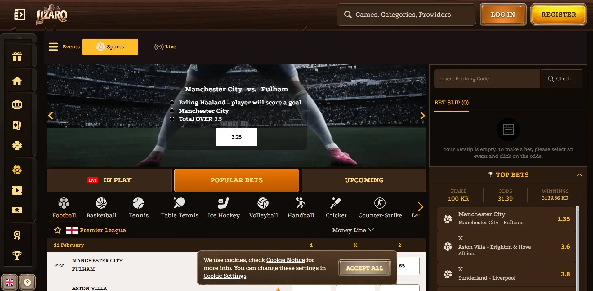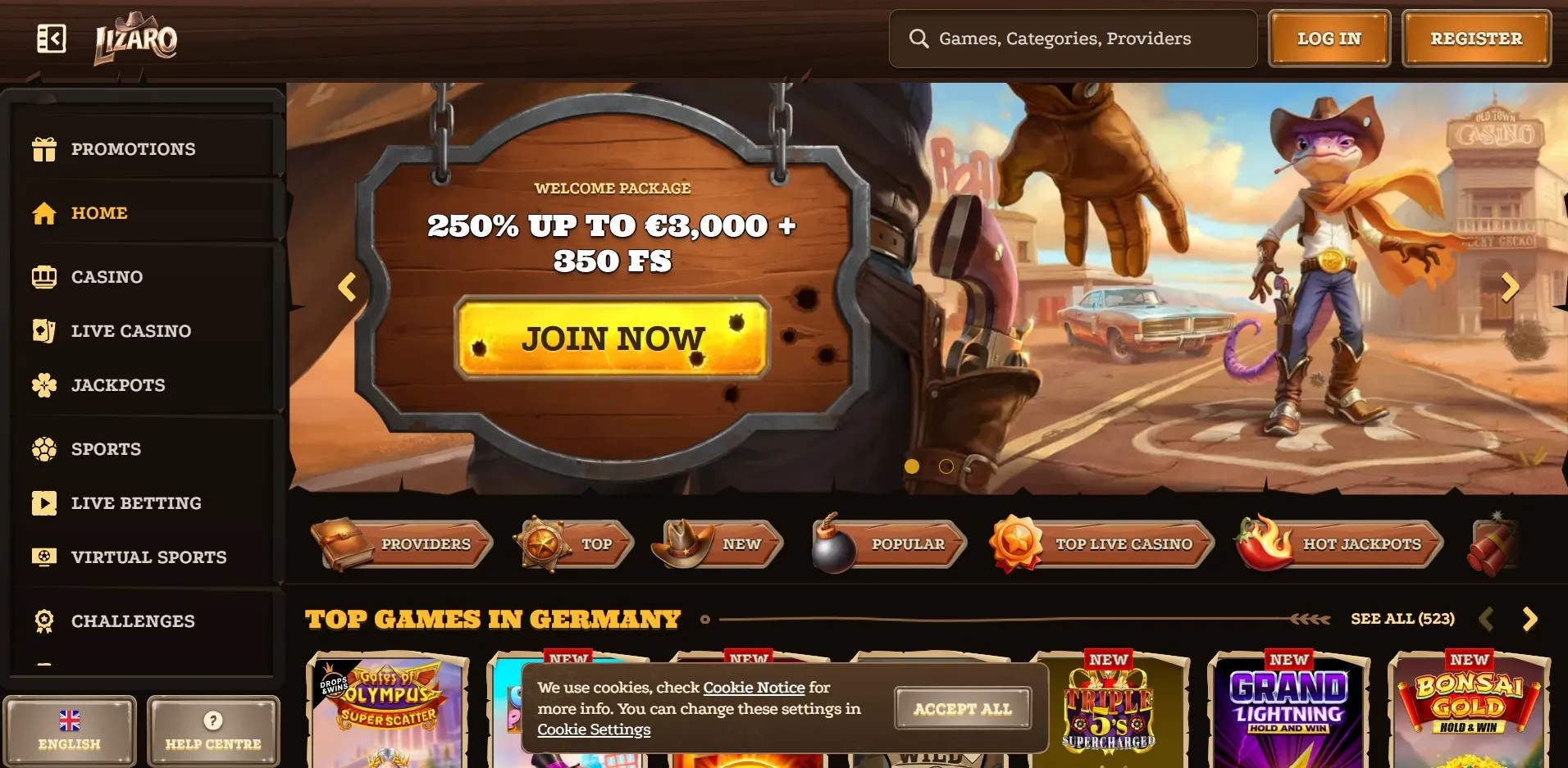 Lizaro offers classic and video slots, progressive jackpots, table games like blackjack and roulette, a live dealer section, and a full sportsbook covering major and niche markets.