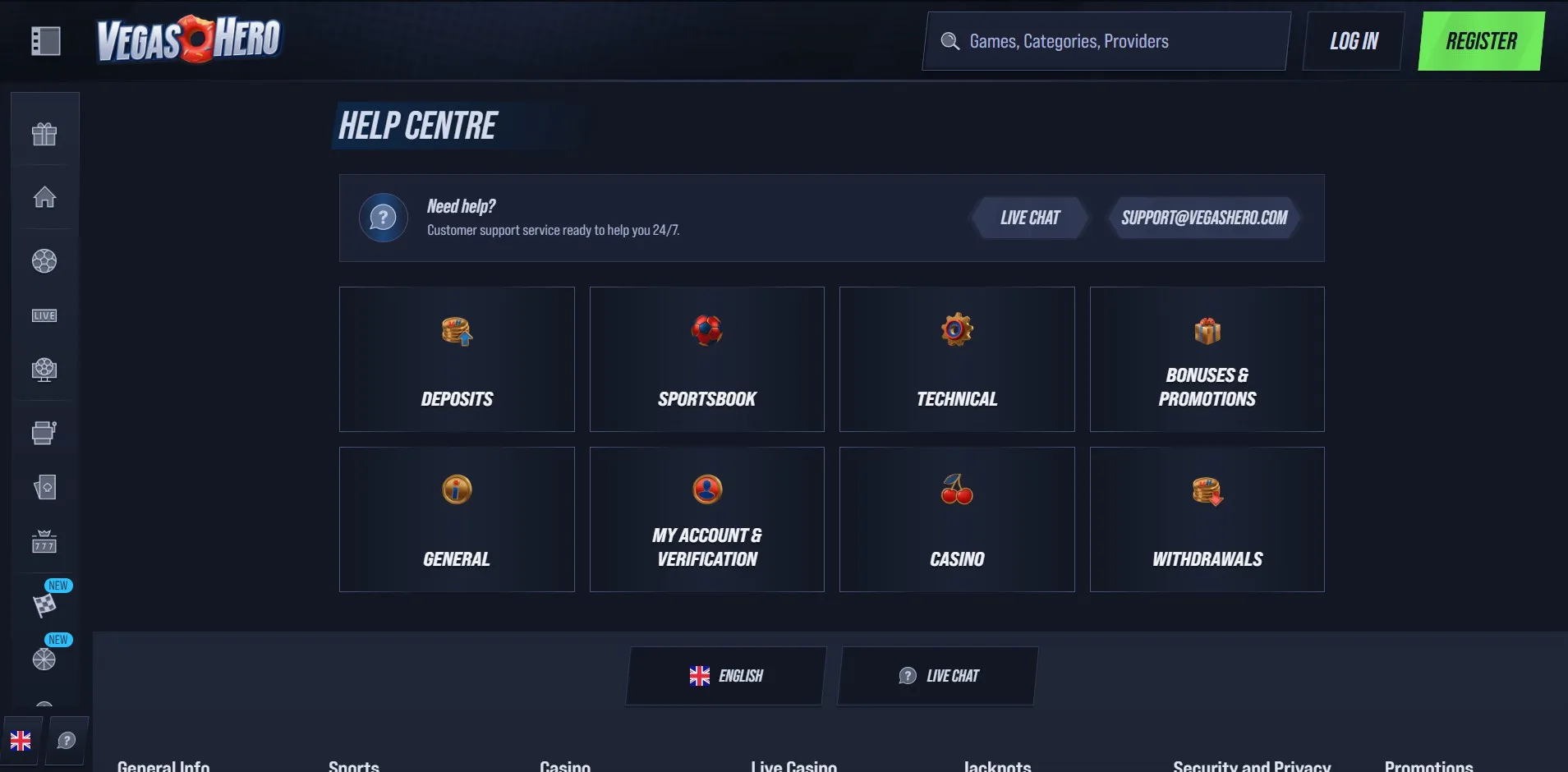 Vegas Hero provides deposit limits, session reminders, cool-off periods, and self-exclusion. It also links to UK support services such as GambleAware and GamCare.